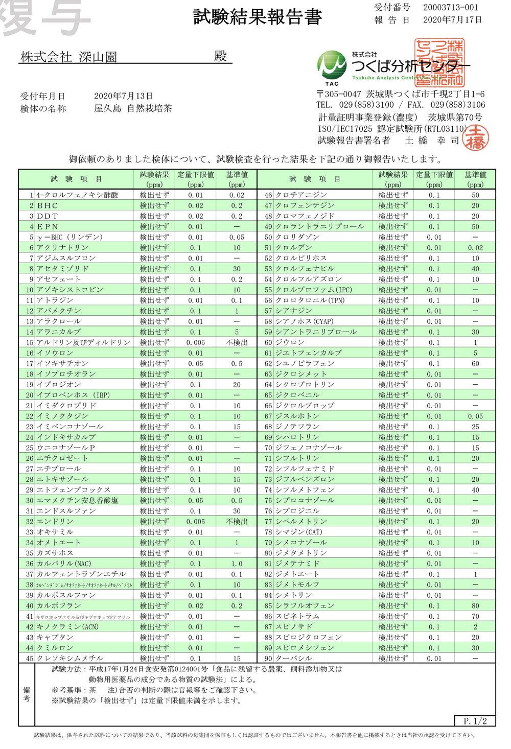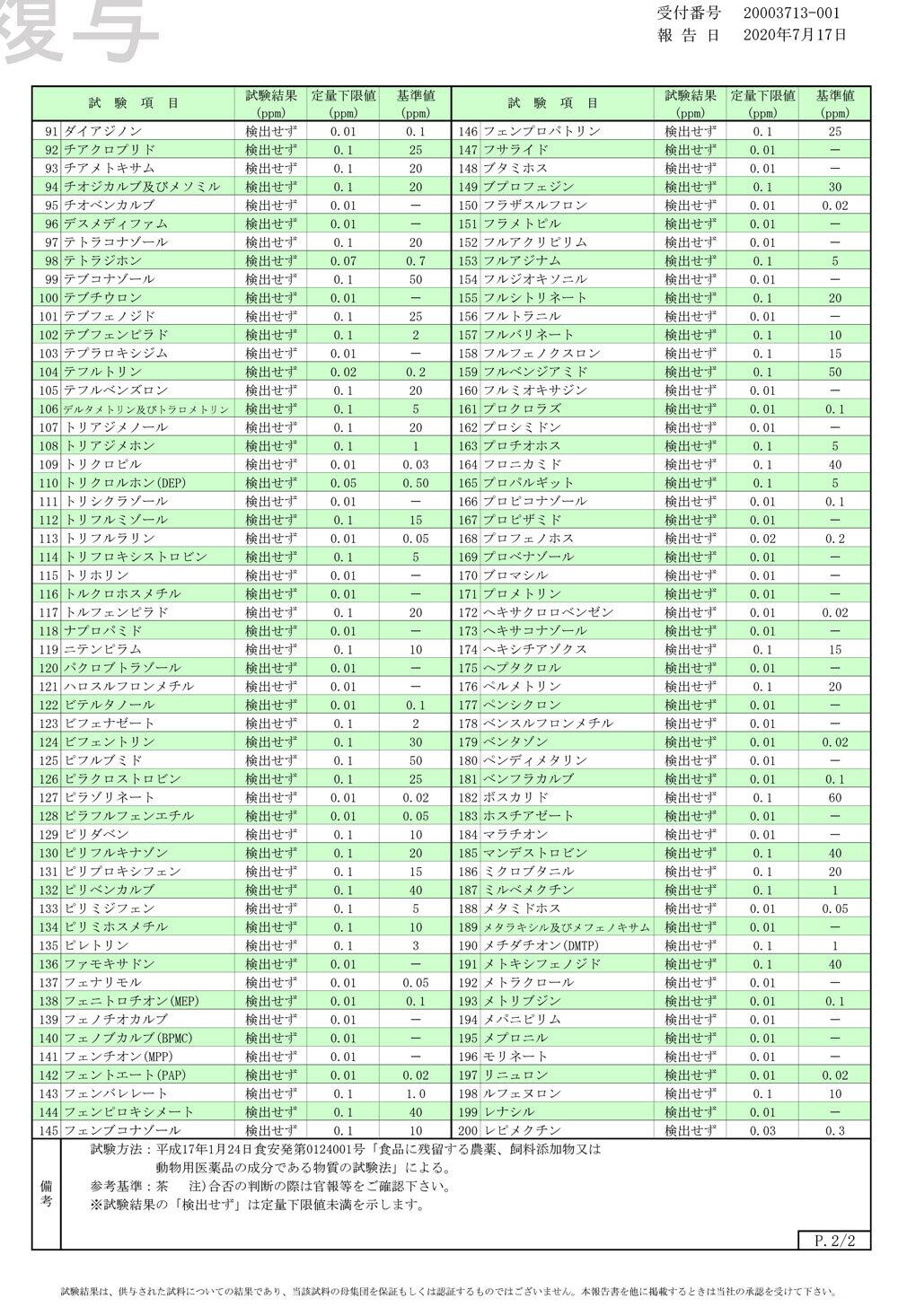 粉末緑茶の喫飲は100%茶葉を体内に摂取するという、非常に理に適った飲み方であります。 しかしながら、残留農薬等の化学物質も100%摂取され、永年にわたり体内に蓄積されていきますので、原料の茶葉は自然のままのお茶でなければなりません。 有機JAS認定の屋久島大崎農場では人工的な農薬・肥料に依存することなく、飛散農薬ゼロの大自然の中で、自然由来の方法で栽培しております。 蜘蛛の巣もカマキリも、お茶作りの一翼をになっております。念のために毎年実施しております 「つくば分析センター」の残留農薬検査結果では主要農薬成分180項目において全て“ 検出せず ”ですので安心してお召し上がりください。